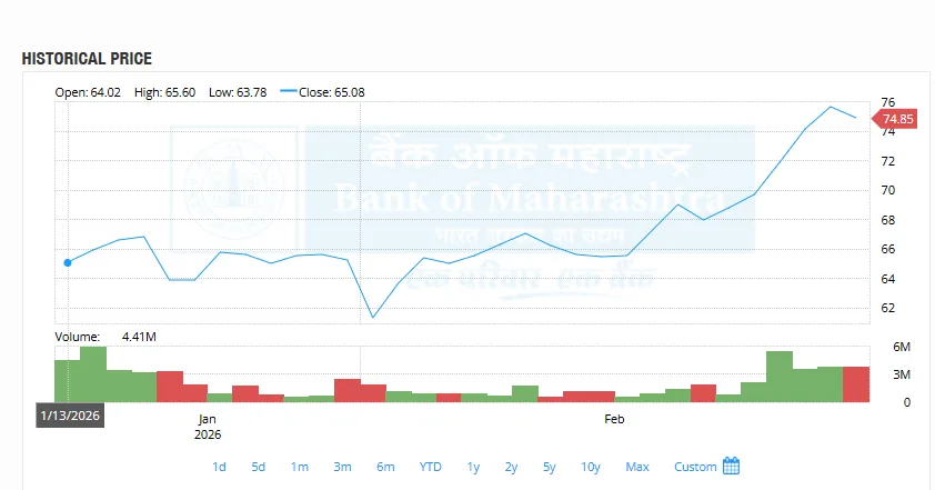 Bank of Maharashtra’s stock has rallied sharply following its quarterly results announced in mid-January. The shares closed at ₹65.08 on 13 January and climbed to ₹74.85 by Friday, 27 February, reflecting strong investor sentiment.