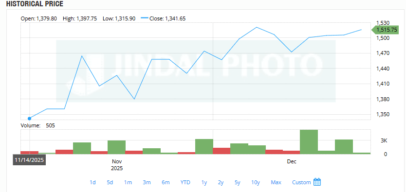 Jindal Photo Limited’s share price has rallied sharply following its quarterly results, rising from ₹1,379.80 on November 14 to ₹1,515.15 as of December 11, marking a 9.81% gain. The post-earnings momentum reflects renewed investor confidence after the company reported a strong turnaround in Q2 FY26, delivering robust profitability and improved operational metrics. The steady uptrend suggests sustained interest from the market, supported by healthy volumes and continued optimism in small-cap outperformers this month.